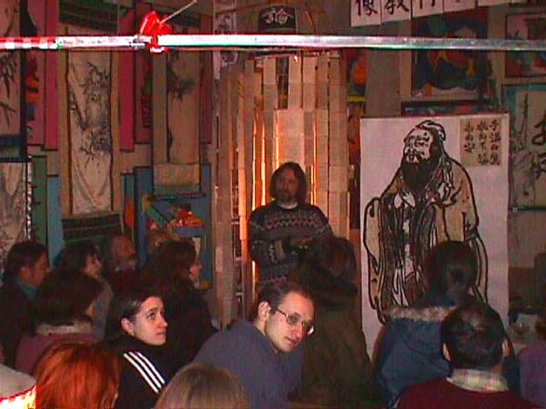 Конфуций - латинизированная форма китайского имени Кун Фу-цзы - "Учитель Кун", Кун-цзы. Кун - фамилия. Его имя - Цю. Его детское имя - Чжунни. Родился в царстве Лу в 551 году до н.э., то есть, 2550 лет назад. Как подсчитал Игорь Бурдонов, 2550 лет - это 85 поколений, если считать, что смена поколений происходит через тридцать лет, как считали китайцы во времена Конфуция. Следующая круглая дата - 90 поколений - будет, очевидно, через 150 лет. Вы видите портрет Конфуция в полный рост - в нем было 1м 91 см. Это копия с картины величайшего китайского художника легендарного У Дао-цзы, эпоха Тан, VIII век. Свою историческую миссию Конфуций видел в сохранении и передаче потомкам древней культуры (вэнь), поэтому не занимался сочинительством, а редактировал и комментировал письменное наследие прошлого. Отсюда его знаменитая фраза: "Я передаю, но не создаю; я верю в древность и люблю ее." С именем Конфуция связаны важнейшие каноны китайской культуры-вэнь: "Ши цзин" - "Книга Песен", "Шу цзин" - "Книга Истории", "Чунь Цю" - летопись "Весны и осени", "Чжоу И" - "Чжоуские Перемены". В I в. до н.э. вместе с "Ли цзи" - "Книгой Ритуалов" - они составили конфуцианское "Пятикнижие" - "У цзин". О некоторых и из этих книг мы будем говорить сегодня на нашем вечере. Влияние Конфуция, однако, не ограничивалось теми, что он редактировал и комментировал. Может быть, гораздо больше он велик как учитель. У Конфуция были тысячи учеников. То, что не сделал он сам, сделали его ученики, ученики учеников, и так далее, - их считают по поколениям. Когда в Китае говорят "Учитель" с большой буквы, без указания имени, всем понятно, что речь идет о Конфуции. Первое, что сделали его ученики первого и второго поколений, - составили сборник высказываний Конфуция. Он называется "Лунь Юй" - "Суждения и беседы", "Беседы и высказывания", "Рассуждения и высказывания", "Аналекты", "Изречения". В нем 20 глав, около 500 параграфов-чжанов (их число различается в зависимости от разбивки текста). Вот с этого фонаря свисает полный текст "Лунь юя" на китайском, английском и русском языках. Русский перевод принадлежит частично Кривцову (из 2-х томника древнекитайской философии 1972 года издания), а частично Переломову, перевод которого вышел в прошлом году и приурочен к 2550-летию Конфуция. Сегодня каждое выступление мы проведем по определенному ритуалу. Перед выступлением каждый участник вечера должен войти - буквально - в образ Учителя, что что будет фиксироваться с помощью фотоаппарата. Для фотографирования мы использовали картину гонконгского художника Peter Mong, написанную им в 1984 году. Здесь Конфуций изображён в официальной одежде чиновника, когда он занимал пост судьи. Художник имел в виду высказывание о Конфуции в "Лунь юе" (последнее изречение 7-й главы): "Учитель был мягок, но строг; внушителен, но не зол; почтителен, но сдержан". Этот же текст написан по-китайски на картине У Дао-цзы. Каллиграфия принадлежит кисти Алексея Мамонова. После выступления проводится соревнование в стрельбе из лука. Во времена Конфуция обучение означало совершенствование в Шести Искусствах: Ритуал, Музыка, Каллиграфия (письмо), Математика (счет), Управление колесницей и Стрельба из лука. Сам Конфуций, по-видимому предпочитал управление колесницей: "Человек из дана Дасян сказал: "Как велик Кун-цзы! Ученость его огромна, но он пока ни в чем не прославился!" Учитель, услышав это, сказ