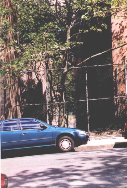 Дом справа - уже известный вам дом на 190-й улице. Если приглядеться в просвет между домами можно разглядеть Бродвей и светофор. Так же на заборе, на фоне дерева, можно разглядеть пластмассовый ящик от бутылок. Он символизирует собой корзину для мяча для игры в баскетбол.