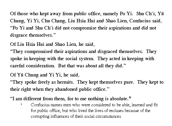 ≈ Неразумно отказываться от службы. Нормы отношений между старшими и младшими отменить невозможно; как же можно отменить справедливые принципы отношений между правителем и чиновниками? Тот, кто хочет остаться чистым, нарушает эти принципы отношений между правителем и чиновниками. Благородный муж идет на службу, дабы выполнить свой долг, а о том, что его Дао-Путь неосуществим, он знал заранее.