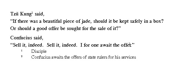 Цзы-гун сказал: "Здесь есть кусок прекрасной яшмы. Спрятать ли его в ящик или же подождать, когда за него дадут хорошую цену и продать?"