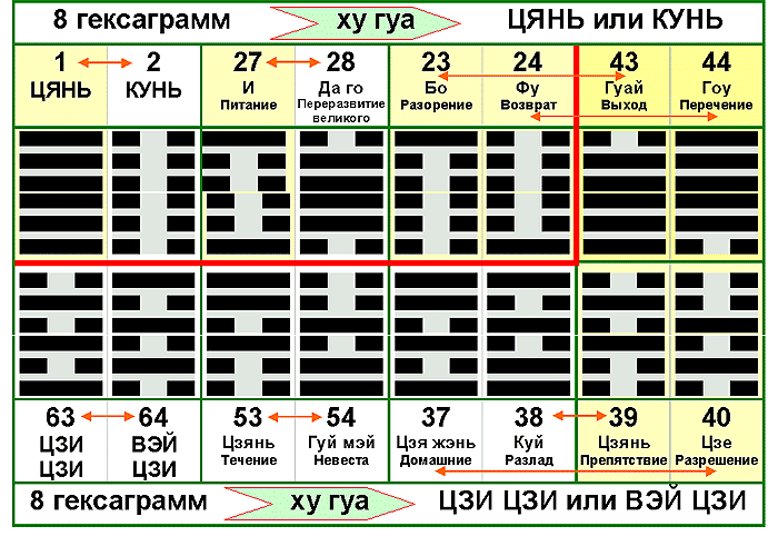 Правда, правило перестает быть глобальным: оно не объясняет, какие гексаграммы должны попадать в центральные клетки квадрантов. В порядке Вэнь-вана это гексаграммы: