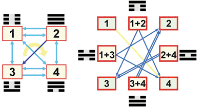 Дело в том, что после одно такого преобразования 64 гексаграммы переходят в 16 гексаграмм, а после второго остается всего 4 гексаграммы. Происходит как бы процесс обобщения, абстрагирования, в котором нескольким гексаграммам ставится в соответствие одна гексаграмма, отражающая некое общее своейство исходных гексаграмм.